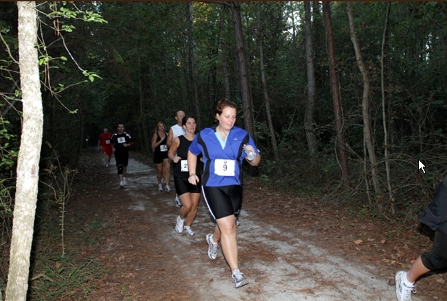 Before I knew it, the race started, and I was running.  Ahem, I was jogging at the pace of old ladies in walkers.  The run was on trails, but fabulous.  At mile one, I looked behind me and there were only about fifteen people back.   Which meant about two hundred were in front of me.  And at that moment, I tripped on a root and nearly lost my footing.  Sweet.