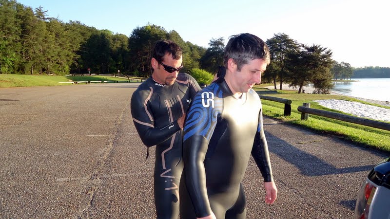 The Expert and I get our wetsuits out of the car, and Coach Monster spots us.  We all chit chat while putting on the suits, and CM helps the Expert into his.