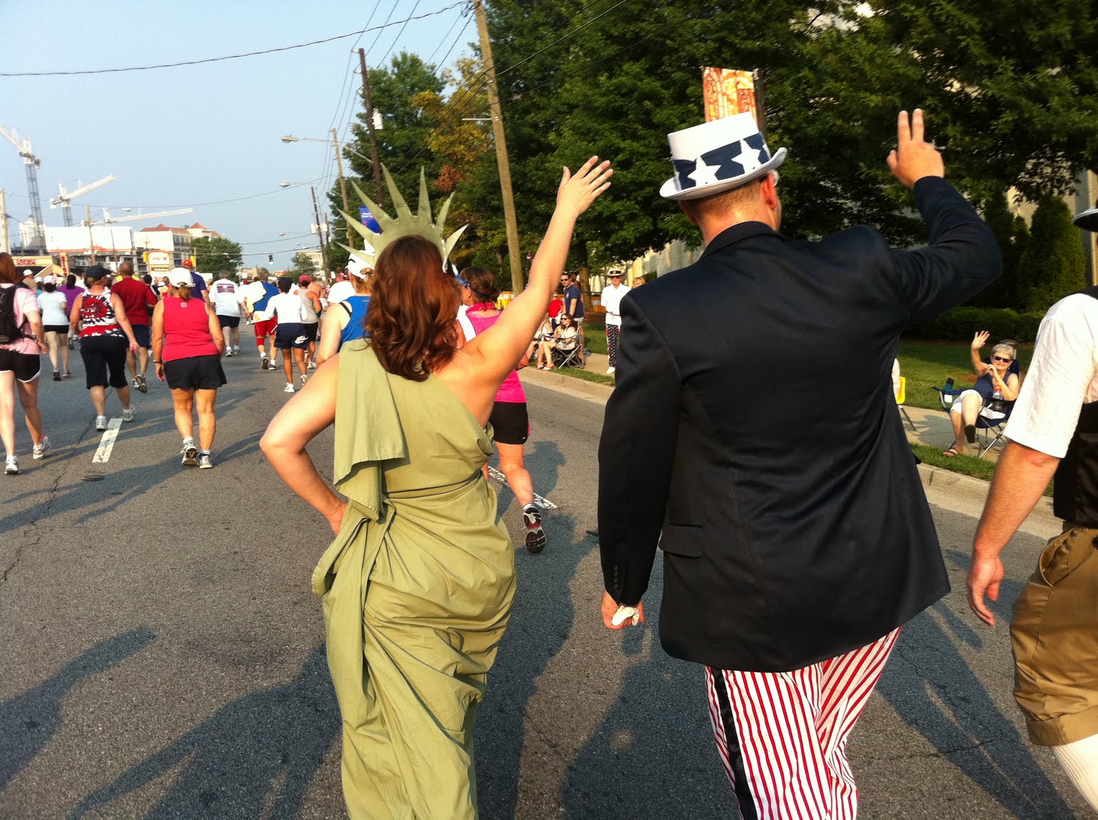 What a great gathering of people. I watched as the Statue of Liberty ran by, I passed a few ladies in sequined running skirts, and some women wearing mustaches (fake ones). I zoomed passed people, I was zoomed past, I paced with one girl most of the run. The spectators were encouraging and funny.